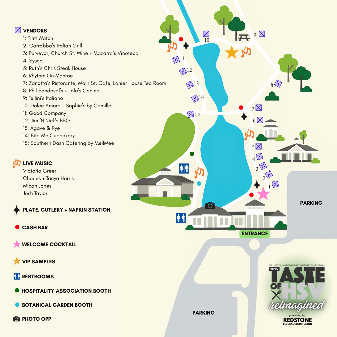 Hosted by the Huntsville-Madison County Hospitality Association (HMCHA), Taste of Huntsville Reimagined will take guests on a scenic stroll through the trails of the Huntsville Botanical Garden, where top local restaurants, caterers, and beverage vendors will serve up creative small bites and sips in a beautiful open-air setting.